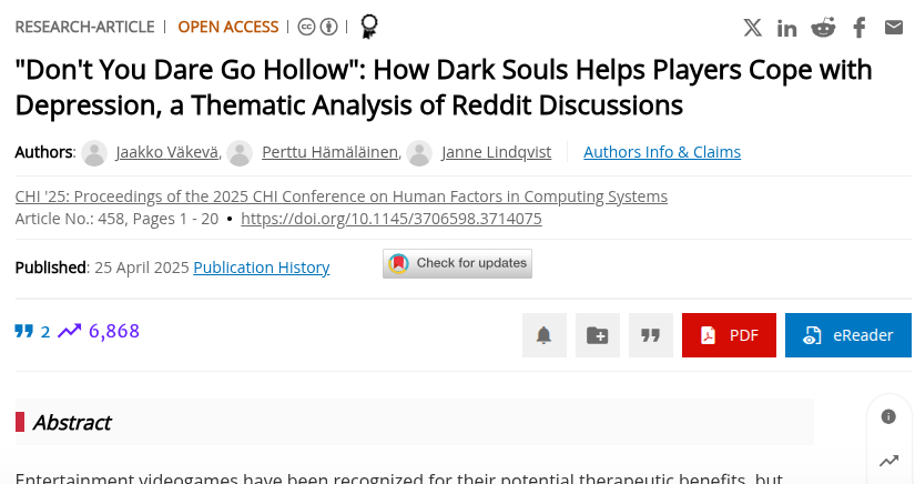 Jaako and Janne were awarded a CHI 2025 Honorable Mention for ‘Don’t You Dare Go Hollow’