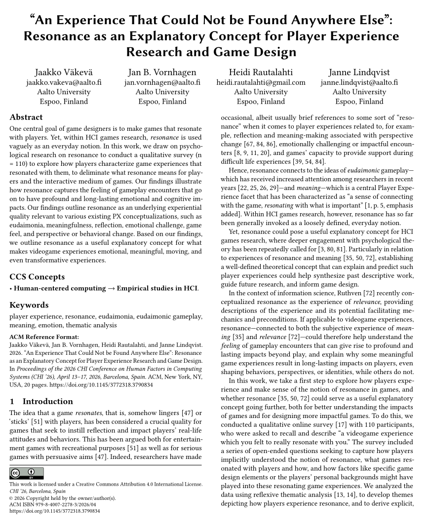 Meanwhile, Jaakko, Jan, Heidi, and Janne got a Best Paper award for “‘An Experience That Could Not be Found Anywhere Else’: Resonance as an Explanatory Concept for Player Experience Research and Game Design”, a qualitative survey on what it means when player experiences resonate and how we could use the concept for future player experience research.